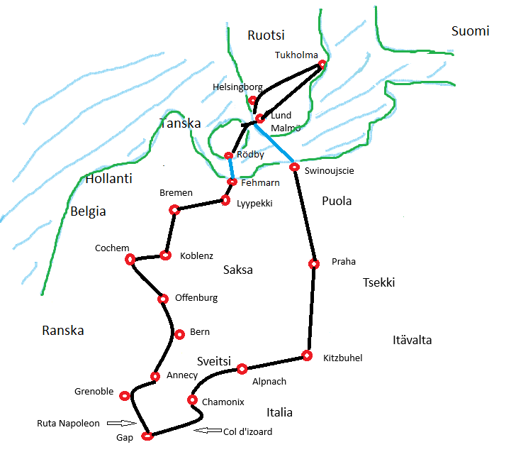 Huom! Nyt kuvatun reitin Annecy-Gap-Chamonix-Alpnach osuus saattaa lyhentyä, jos matka alkaa painamaan, päivällä tai parilla. Tällöin saatamme ajaa suoraan Annecystä Alpnachiin tai jopa Etelä-Saksasta Alpnachiin. Muutkin muutokset ovat mahdollisia, mutta reissu pyritään pitämään 11-13 päivän mittaisena. Saksasta pääsee Suomeen suoraan myös laivalla Travemundestä, jos ajaminen Ruotsin läpi ei enää maistu. Jotta vapaus reittivalintoihin säilyy, kannattaa hotellivaraukset tehdä vain matkan alkuosuudelle. Koska matkaamme vilkkaimman turistiajan ulkopuolella, on hotelleissa yleensä hyvin tilaa, ja varaukset voidaan tehdä vasta edellisenä iltana. Huomaa, että voit myös poistua ryhmän matkasta, tehdä oman lenkin, ja palata ryhmään myöhemmin.
