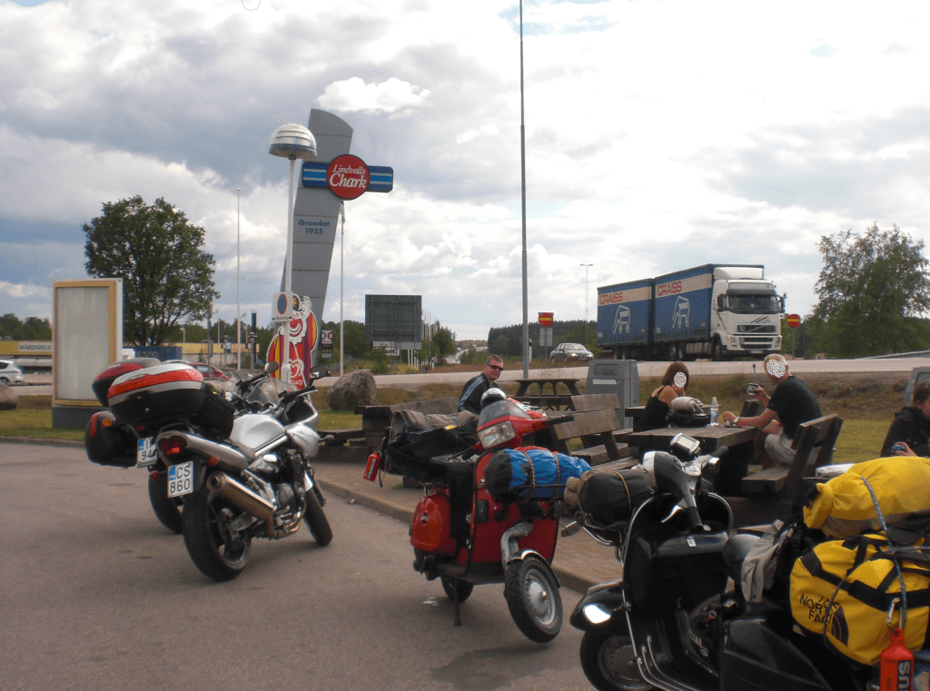 9. päivä: Helsingborg-Tukholma. Aamulla suuntasimme kohti Tukholmaa ja vietimme päivän satulassa matkaamalla samaa Ruotsin halki kulkevaa reittiä, mitä pitkin olimme reilu viikko aikaisemmin ajaneet toiseen suuntaan. Muutama pysähdys ja tankkaus matkan varrella ja loppuiltapäivästä olimme Tukholmassa. Olimme varanneet paikat Turkuun menevältä lautalta, joka lähti illan suussa, joten aikaa oli tapettavaksi asti. Sen vietimme kuumassa kesäsäässä ajellen ja päivää paistatellen Djurgårdenin alueella. Matkaa laivalle noustessa oli kertynyt 560 km.