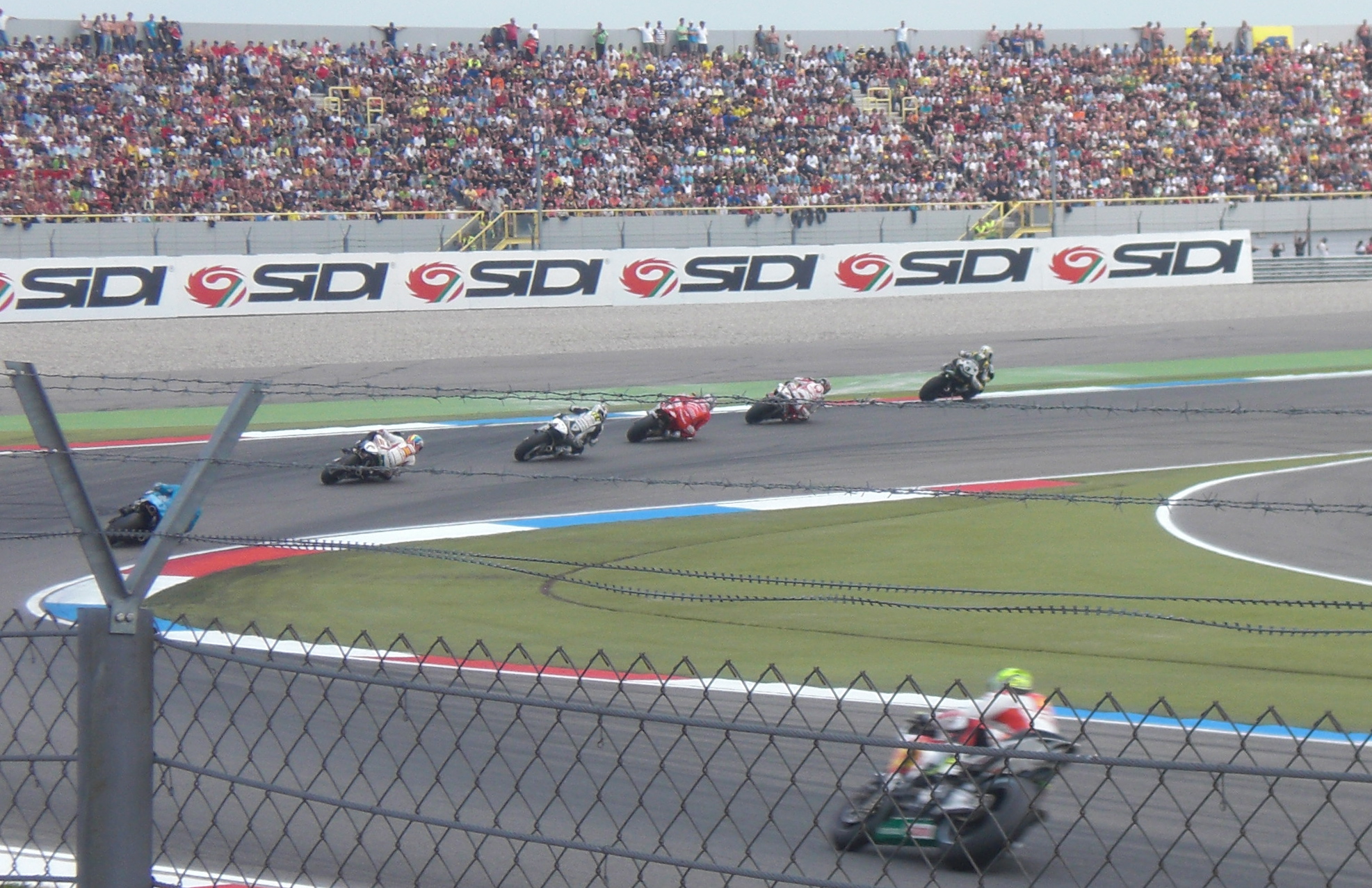 7. päivä: Apeldoorn-Bremen (Assen). Oli sunnuntai ja retken kohokohta, Assenin MotoGP-kisa, odotti. Majapaikastamme oli matkaa Asseniin yli sata kilometriä ja siitä muodostui erikoinen taival pitkin moottoritietä. Autoilijat pysyttelivät pois Asseniin johtavilta pääväyliltä, koska ne täyttyivät kisaa seuraamaan matkalla olevista moottoripyöräilijöistä, joita sinne saapuisi noin satatuhat. Teillä ei siis juuri muuta liikennettä ollut kuin yhtenäisenä nauhana kohti Assenia ajavat motoristit ja paikalliset ihmiset kerääntyivät moottoritien ylimenosilloille hurraamaan meille kisaan matkalla oleville pyöräilijöille. Erikoista ja ilmassa oli selvästikin sitä suuren urheilujuhlan tuntua. Koska rata oli aivan kaupungin tuntumassa, ohjattiin pyöräilijät jo kaupunkiin sisääntuloväylillä tiettyyn ’putkeen’, mikä johti moottoriradan parkkipaikalle. Istuinpaikkamme oli aivan pääsuoran lopussa, mistä pääsimme todistaman kolmen eri luokan kilpailut, Rossin 100 kisavoiton ja Mika Kallion valitettavan kaatumisen viimeisellä kierroksella ollessaan hyvissä asemissa. Täytyi taas ihmetellä, kuinka televisio latistaa kisaa ja saa ammattilaiskuskien huippuvaihdin näyttämään paljon todellista alhaisemmalta. Kisan loputtua oli vuorossa pyörien etsiminen muutaman kymmenentuhannen muun pyörän joukosta, mikä olikin yllätykseksi helppo tehtävä. Parkkipaikka oli järjestetty siten, että hiekkakentän pituussuuntaan oli upotettu muutaman metrin mittainen kivi. Nämä kivet muodostivat sitten useamman sadan metrin mittaisen kivijonon, johon kuskit laittoivat moottoripyöränsä jalan. Näin pyörät olivat kentällä siisteissä riveissä eikä edes opastajia tarvittu. Nerokasta. Kisan jälkeen ajoimme samaan ’putkeen’, mitä pitkin olimme kaupunkiin tulleetkin. Olisimme halunneet suunnatta kohti Saksaa itään, mutta ’putki’ vei meidät etelään suuntaavalle väylälle, samalle mitä pitkin olimme tulleet. Moottoritiellä oli edessä jälleen sama näytelmä ja tien varsille kerääntyneet ihmiset hurrasivat meille kisasta palaaville pyöräilijöille. Pienen reitin tutkiskelun jälkeen suuntasimme kohti Bremeniä, tällä kertaa sitkeästi moottoritiellä pysyen ohi Leerin kaupungin. Selvästikin kisa vielä kummitteli moottoripyöräilijöiden takaraivossa, sillä melko hyvää vauhtia itsekin ajellessamme matkasi noin kymmenen moottoripyörän ryhmän ohitsemme parisataa mittarissa. Matka siis taittui melko rivakkaan. Mielenkiintoiselle päivälle tuli mittaa 360 km.
