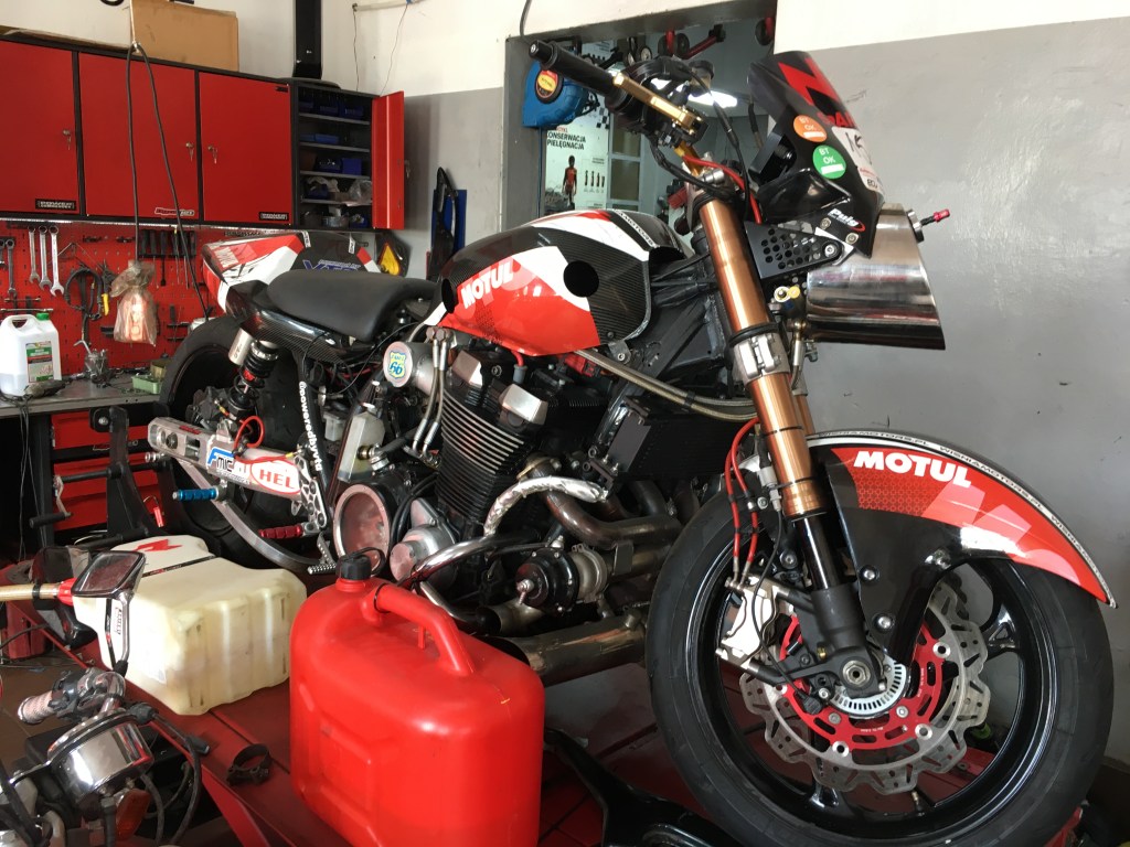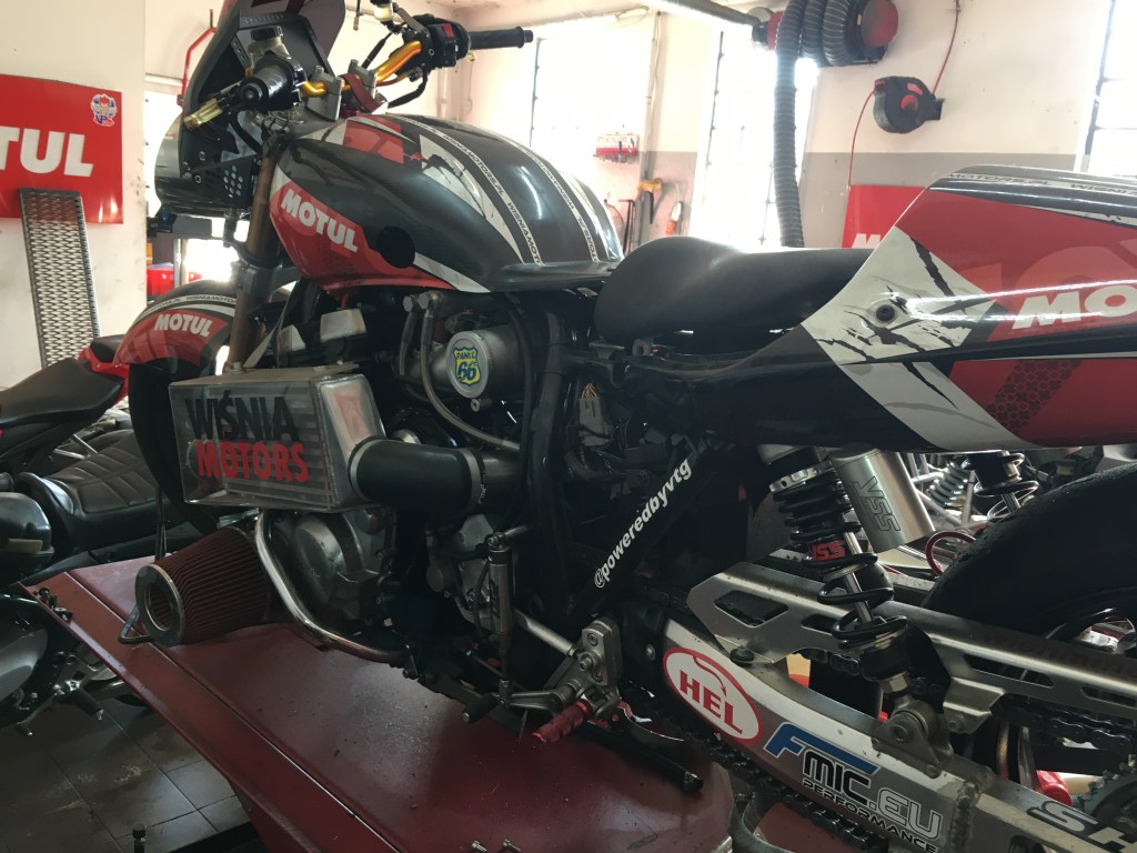 4. päivä: Sopot-Rewal. Heräsimme perjantai-aamuun ja ensimmäiseksi olisi löydettävä jostain mekaanikko, joka korjaisi pyöräni öljyvuodon. Soittelin paikallisiin korjaamoihin ja vihdoin tärppäsi. Sain ajo-ohjeet ja paikalle saapuessani mekaanikko ehdotti, että voisi korjata pyöräni maanantaina. Vetosin siihen, että meillä ei ollut kaupungista varattu hotellia enkä voisi odottaa maanantaita. Aikamme keskusteltuamme hän soitti esimiehelleen ja kysyi lupaa ottaa pyöräni seuraavaksi työn alle. Kun tuo lupa tuli, seurasin vierestä kuinka kaveri rakenteli käsin uuden tiivisteen, korjasi vuodon ja tarkasti pyörän toiminnot muutenkin ja esitteli vielä minulle korjaamon omistajan kiihdytysajoissa käyttämän menopelin. Hintaa parin tunnin työlle tarvikkeineen tuli 55 euroa. Puolassa valuutta on zloty, jota minulla ei ollut tarpeeksi, eikä pankkikortti kelvannut, joten kävelin nostamaan rahaa läheisestä automaatista. Onnekseni toinen korjaamon asiakas lähti mukaani, sillä raha-automaatti imaisi korttini ja tämä ystävällinen paikallinen kaveri soitti automaatin kyljessä olevaan palvelunumeroon. Automaatti startattiin uudelleen etäyhteydellä ja masiina sylki kuin sylkikin korttini ulos. Lopulta rahanvaihto onnistui erillisessä rahanvaihtopisteessä. Sitten kävin maksamassa velkani, kiittelin kovasti hyvästä työstä, annoin mekaanikolle kahdenkympin tipin ja ajoin huojentuneena takaisin hotellille. Timo oli käyttänyt aamupäivän ajelemalla sähkömopolla Sopotin ja Gdynian välisellä rantatiellä. Oli kuulemma ollut antoisa reissu. Käväisin vielä ottamassa satamassa muutaman valokuvan, minkä jälkeen lähdimme matkaan kohti Saksan rajalla sijaitsevaa Swinoujscien kaupunkia. Ajoimme pääasiassa pienempiä teitä pitkin aina rannikolla sijaitsevaan Rewalin kaupunkiin asti. Päivä oli ollut pitkä, matkaa tehty 310 km ja koska emme olleet vielä tehneet hotellivarausta, päätimme tehdä sen Swinoujscien sijaan Rewalista. Illasta jäi päällimmäisenä mieleeni mereltä lähestynyt rankkasadekuuro ja kuinka rantaravintolan terassi tyhjeni parissa minuutissa asiakkaista kun kuuro iski.