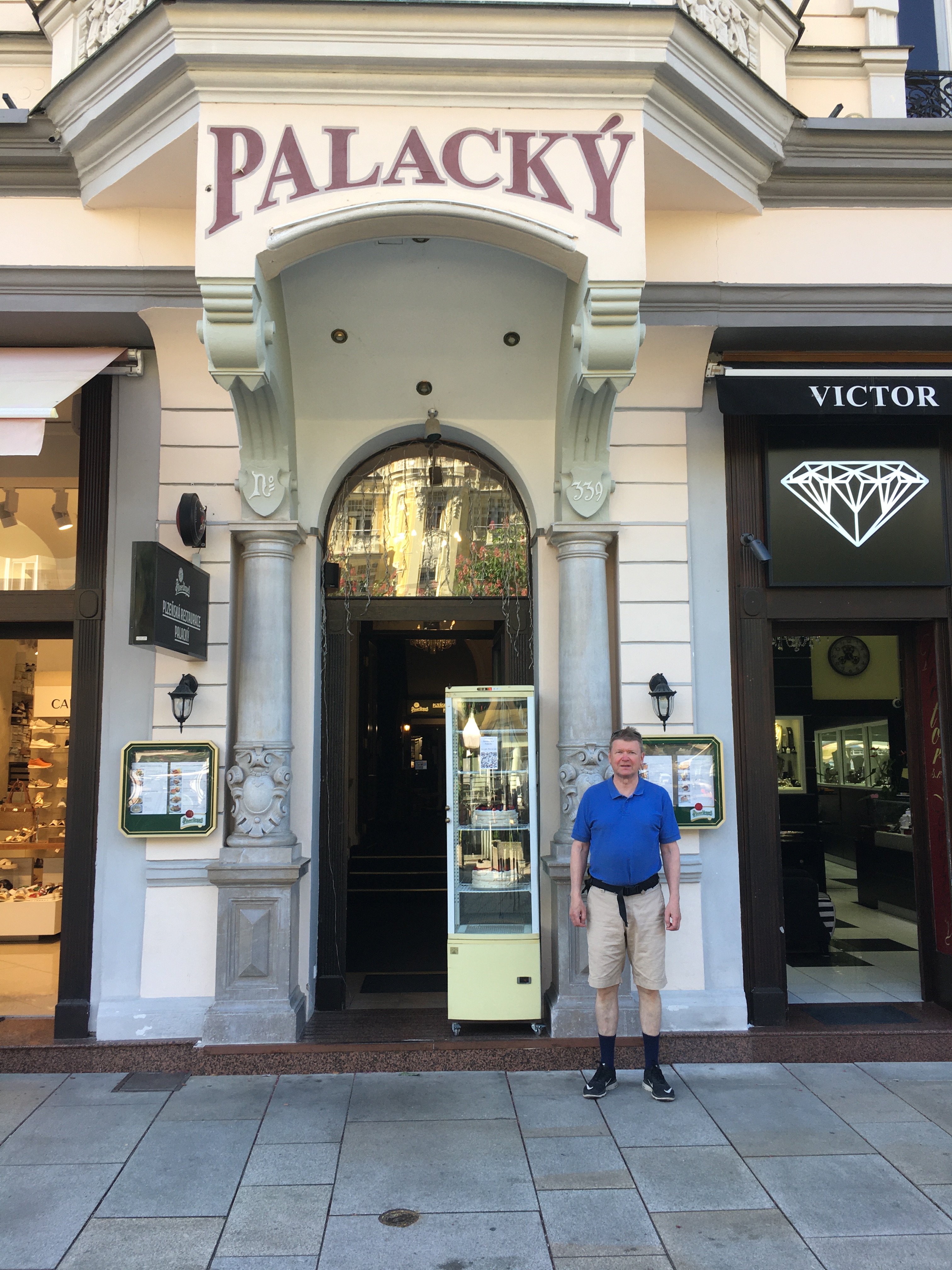 Tämä on ajopäivä ilman suurempia pysähtymisiä. Alkuperäinen suunnitelma oli ajella päivän päämäärään lyhintä reittiä pitkin pienempiä teitä, mutta matka-aika olisi pidentynyt kahdella tunnilla, joten valitsimme motarin. Sivuutimme Brnon ja Prahan ja suuntasimme sattumalta majapaikaksi valittuun Karlovy-Varyyn, mikä yllätykseksi olikin vuoriston keskellä laaksossa sijaitseva kylpyläkaupunki, jonka maaperästä pulppusi kuuma vesi. Muita motoristeja ei näkynyt, mutta autokantaan olivat vieraat panostaneet. Parkkipaikoista oli huutava pula ja pienen neuvottelun jälkeen saimme jättää pyörämme naapurihotellin parkkipaikalle varttitunniksi, hotelliimme sisäänkirjautumisen ajaksi. Pidempiaikainen parkkipaikka löytyi sitten kaupungin laitamilta. Illalla ruokailupaikan valinnassa riitti hyvin vaihtoehtoja.