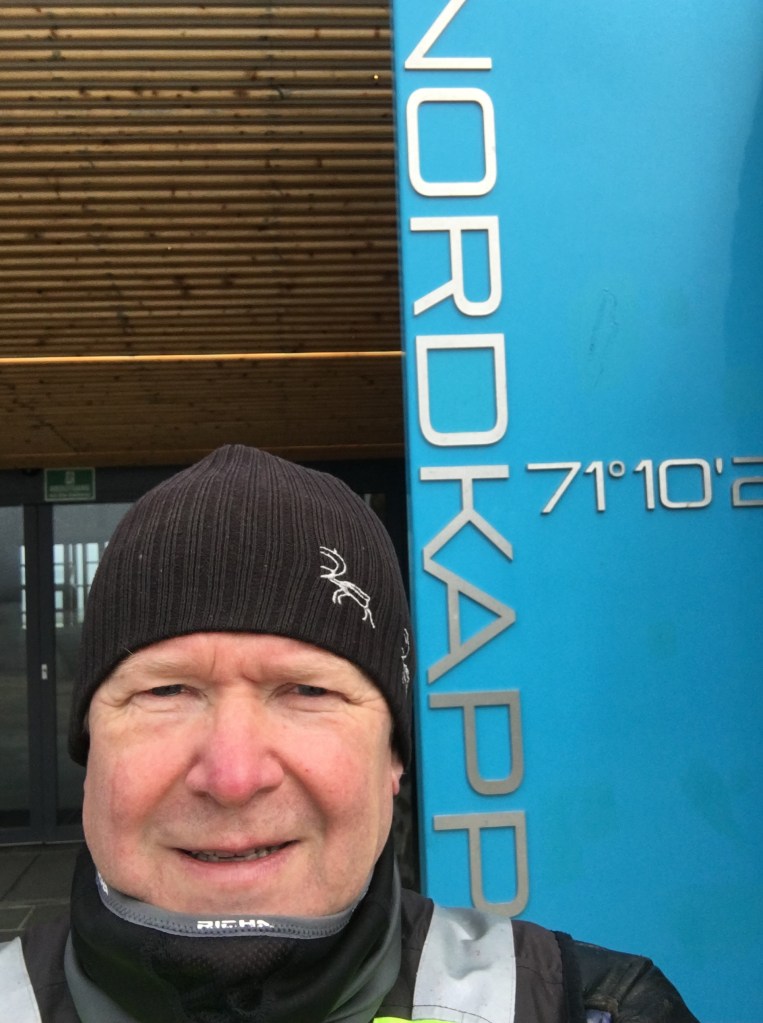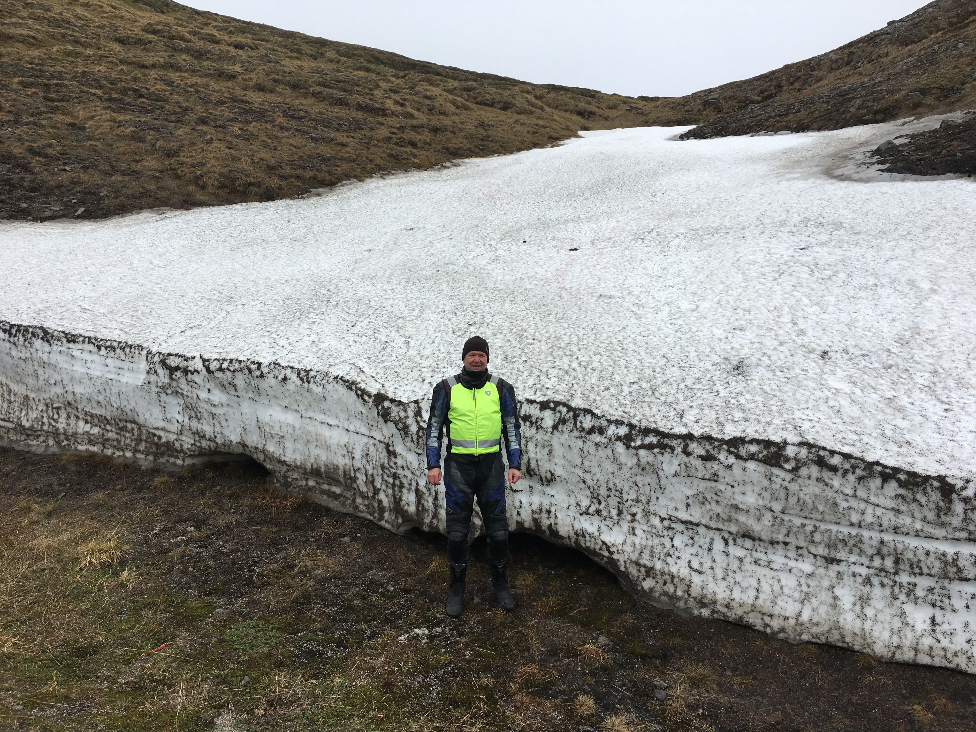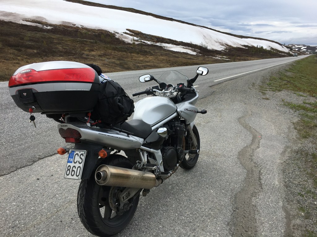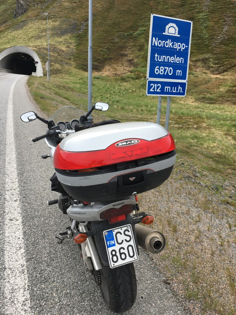 Sitten olikin vuorossa pitkä päivärupeama ja rajan ylitys Norjaan Karigasniemessä. Koronarajoitukset olivat juuri sopivasti löystyneet ja pääsimme jatkamaan matkaa kohti Nordkappia. Seuraava yöpyminen oli Honninsgvågin kuvankauniissa satamakaupungissa, minne päästäksemme ajoimme muutaman tunnelin läpi, joista pisin, Nordkappin saarelle johtava tunneli oli noin kuuden kilometrin mittainen. Tunnelin heikko valaistus ja kypärän tumma visiiri olivat huono yhdistelmä, tarkkana sai olla. Honningvågista lähdettäessä oli vuorossa Nordkapissa käynti, minne oli noin puolen tunnin matka. Teiden varsilla näkyi vielä kesäkuullakin paikoitellen noin metrin lumikerros. Nordkappista palasimme tuloreittiä Olderfjordiin, missä pienen pysähdyksen jälkeen otimme suunnan kohti Hammerfestiä. Paikoitellen oli ajo sen verran viileää että laitoin ajopuvun päälle kunnon vahvan talvitakin.