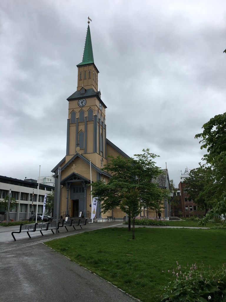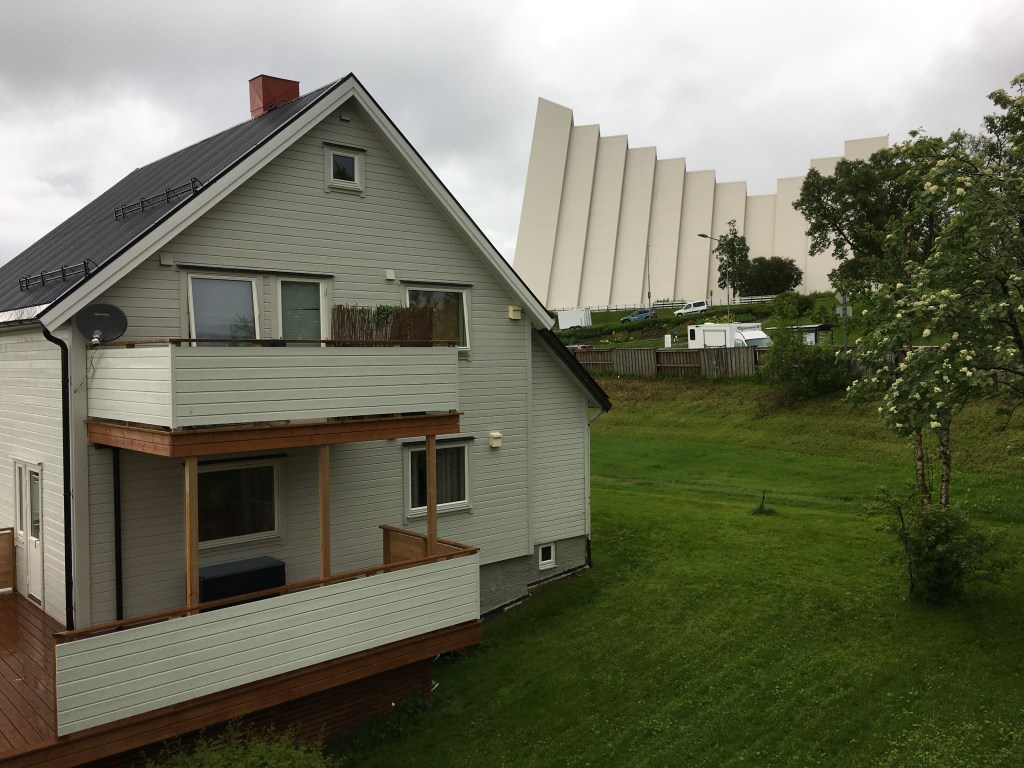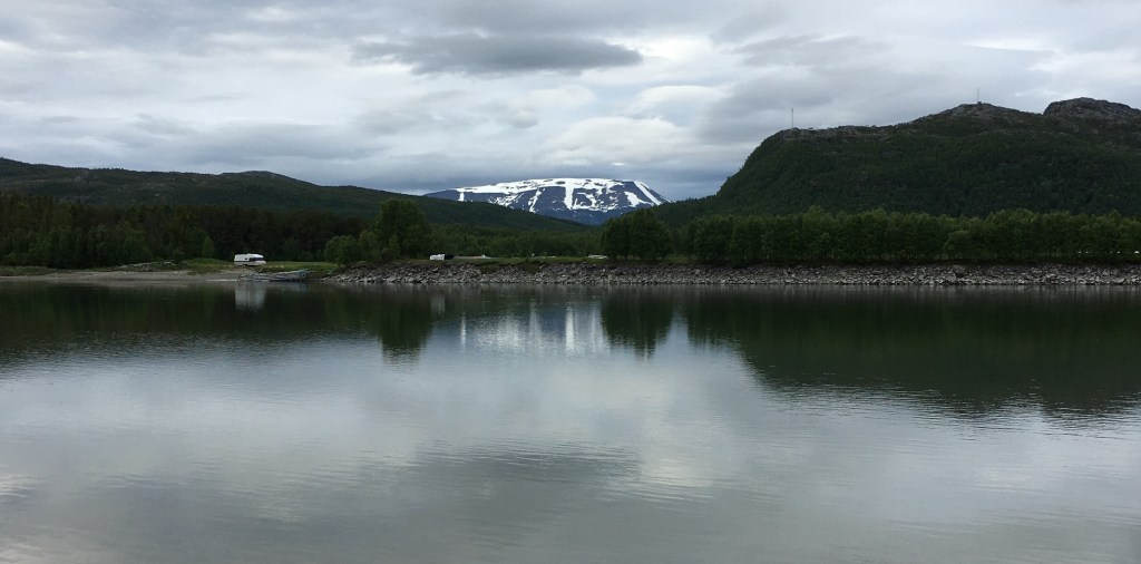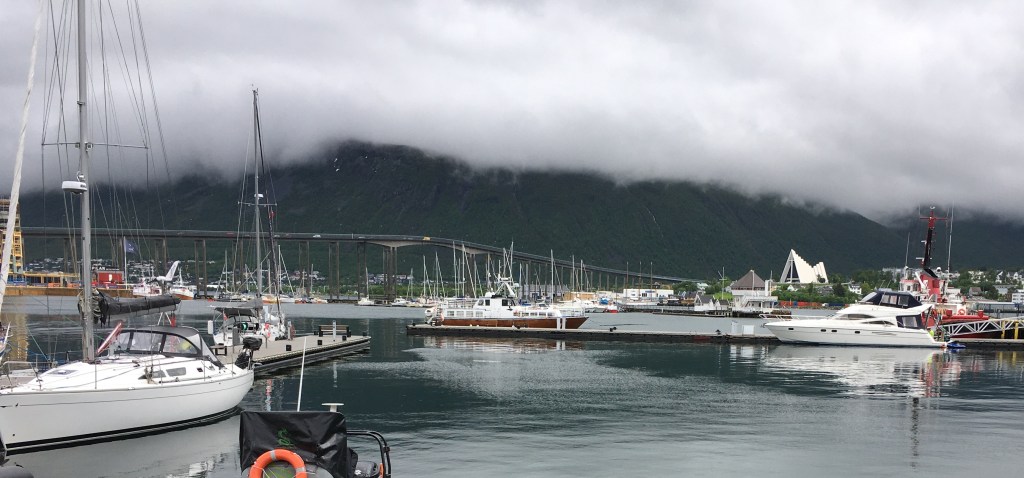 7. päivä: Storslett-Kilpisjärvi. Päivä alkoi Olderdalenin-Lyngseidet lautan aikataulua tutkimalla. Tarkoituksemme oli matkata Tromssaan oikotietä, mikä tiesi kahta eri lauttamatkaa. Jälleen oli sääennusteessa pientä sateen uhkaa, joten matkaan oli lähdettävä ajoissa. Päivän matka alkoi ajamalla merenrantaa pitkin Olderdalenin lautalle. Lauttamatka kesti puolisen tuntia ja seuraava lauttamatka oli edessä Svensbyssä. Pian jo lähestyimme Tromssaa. Aikaisemmasta Tromssassa käynnistäni oli kulunut lähes puoli vuosisataa. Tuolloin matkaajaa tervehti kaupunkia lähestyessä sankka kalan haju. Nyt tuo kalan halu oli poissa ja edessä oli mukavalta vaikuttava keskikokoinen merenrantakaupunki. Vain kirkko kaupungin sisääntulosillan vieressä vaikutti tutulta. Tromssan puiset kaupparakennukset samoin kuin satamassa kelluvat avoveneet, joiden perässä oli useampisatahevosvoimaiset perämoottorit, hivelivät silmiämme. Tromssasta oli aika jatkaa kohti Suomen rajaa ja valitsimme nopeimman ajoreitin. Ennen Skibotniin saapumista alkoi aurinkokin paistella tunturin yläpuolella makaavan pilvimassan takaa. Skibotnissa laitoimme vilkun oikealle ja suuntasimme keulat kohti Kilpisjärveä, minne oli vielä noin puolen tunnin ajomatka. Tosin ennen Kilpisjärveen saapumista oli rajalla edessä pakolliset koronatarkastukset. Matkaa tälle vaiherikkaalle päivälle tuli 280 km.