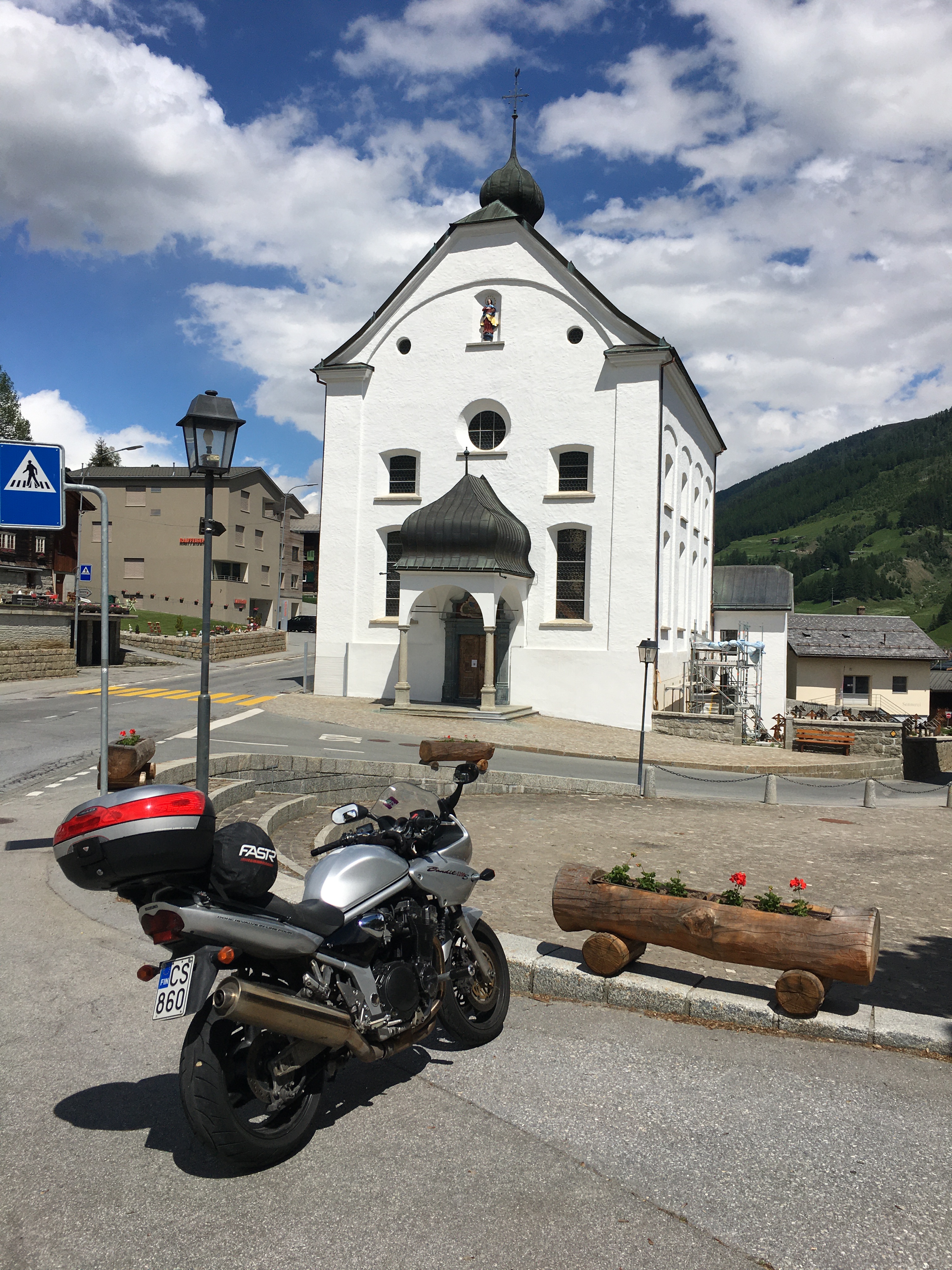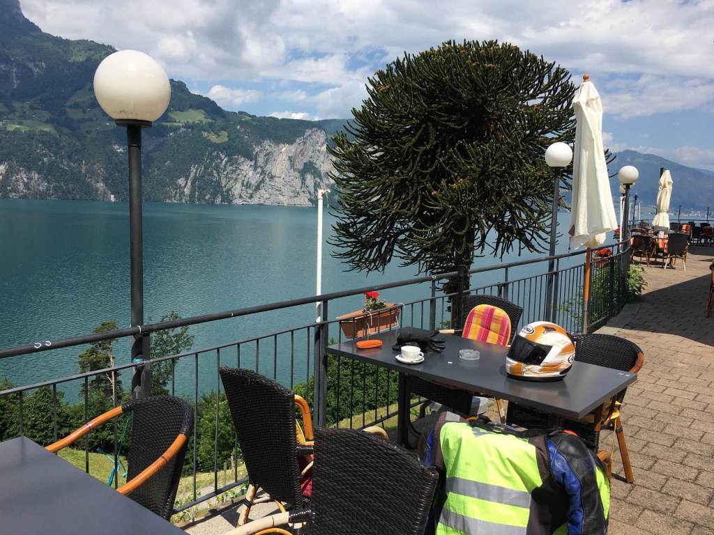 7. päivä: Bern-Wassen. Tämä oli ’vuoristopäivä’. Bernistä suuntasin jälleen moottoritielle, mitä pitkin ajelin Geneve-järjen itäpuolella sijaitsevan Montreux kaupungin kupeeseen, missä pysähdyin ottamaan valokuvia. Matkalla olin jo miettinyt vaihtoehtona, että ajaisin Lausannen yliopistokaupungin kautta, mutta jätin tuon mutkan tekemättä. Montreuxista matka jatkui kohti Martignya ja Sionin kaupunkia, joka sijaitsi jo vuorten välisessä laaksossa. Bernissä olin kaatanut pyöräni kävelyvauhdissa ja nyt vasemman puoleinen peili ei pysynyt yläasennossa. Oli hieman hankalaa nostaa peili yläasentoon joka kerta ennen kaistanvaihtoa ja ohitusta. Eräällä levähdyspaikalla sain kuitenkin peilin kiinnityksen korjattua ja matka jatkui taas turvallisesti. Nyt vastoin kaikkia ennakko-odotuksia tie alkoi nousta pitkin vuoren rinnettä. Mutkiin oli laitettu parin metrin välein noin kahden vaaksan korkuiset pylväät. Minkäänlaisia kaiteita ei ollut. Olisiko näiden pylväiden tarkoitus estää mahdolliset ulosajot ja rotkoon tippumiset? Tasamaa-ajoon tottuneena päästin lähes kaikki muut tiellä liikkujat ohitseni. Noin tunnin päästä vesi- ja lumisateen jälkeen löysin itseni kaksi kilometriä korkeammalta toivoen, että tie kääntyisi vihdoinkin laskusuuntaan. Kun sitten laskusuunta alkoi, pysäytin tien viereen ja huomasin kyltin ’James Bond Strasse’. Gold finger-elokuvan takaa-ajokohtaukset oli kuvattu näillä tieosuuksilla. Mukava sattuma. Hotelli löytyi lopulta ja ystävällinen majatalon isäntä toivotti minut tervetulleeksi. Samaan hotelliin oli majoittunut noin kymmenen hengen englantilaisporukka, niin ikään motoristeja. Porukka ihmetteli, että olin lähtenyt tällaiselle matkalle yksin Suomesta asti. Mielenkiintoiselle päivälle tuli mittaa ’vain’ 300 kilometriä, mutta tuntui kuin olisin ajanut tuplamatkan.