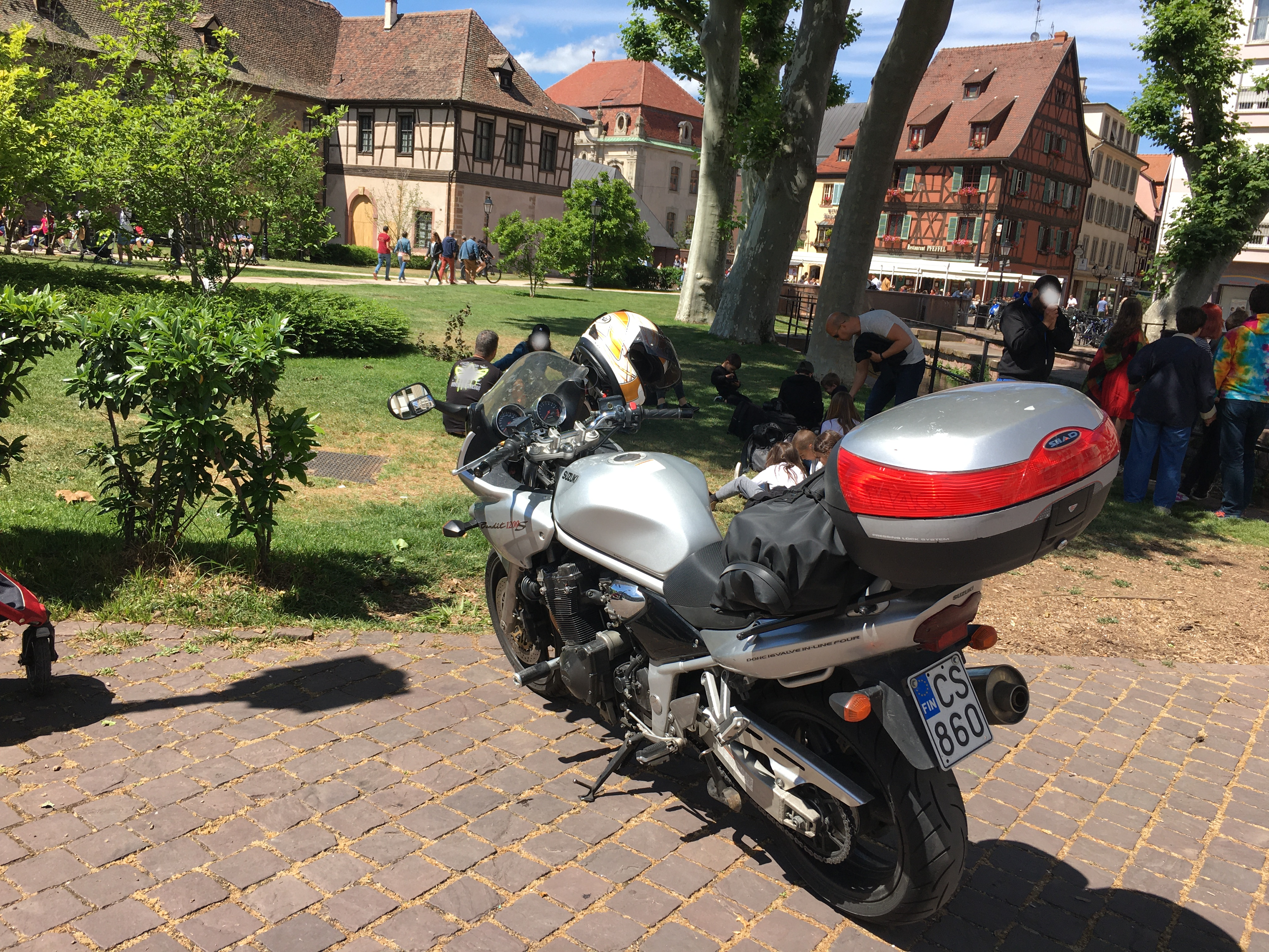 6. päivä: Luxemburg-Bern. Tämä päivä oli jonkinlainen ’kokemusten päivä’. Luxemburgista jatkoin matkaa kohti Ranskaa ja Strasbourgia. Matka eteni ’motaria’ pitkin, mutta maasto oli vaihtelevaa eikä liikennettäkään juuri ollut. Strasbourgia lähestyttäessä oli jonkin verran tietöitä ja tietulleja. Halusin vierailla katsomassa keskustan katedraalia ja onneksi kylttejä seuraten sinne lopulta pääsinkin. Parkkipaikka tässä vilkkaassa kaupunginosassa löytyi erään isomman roskalaatikon viereltä. Paikan oli löytänyt jo toinenkin moottoripyöräilijä. Noin tunnin kävelykierroksen jälkeen palasin pyörälle. Nyt toinen pyörä oli hävinnyt ja rikkonut mennessään oikean etuvilkkuni. ’Jesarilla’ sen onneksi sain korjattua.