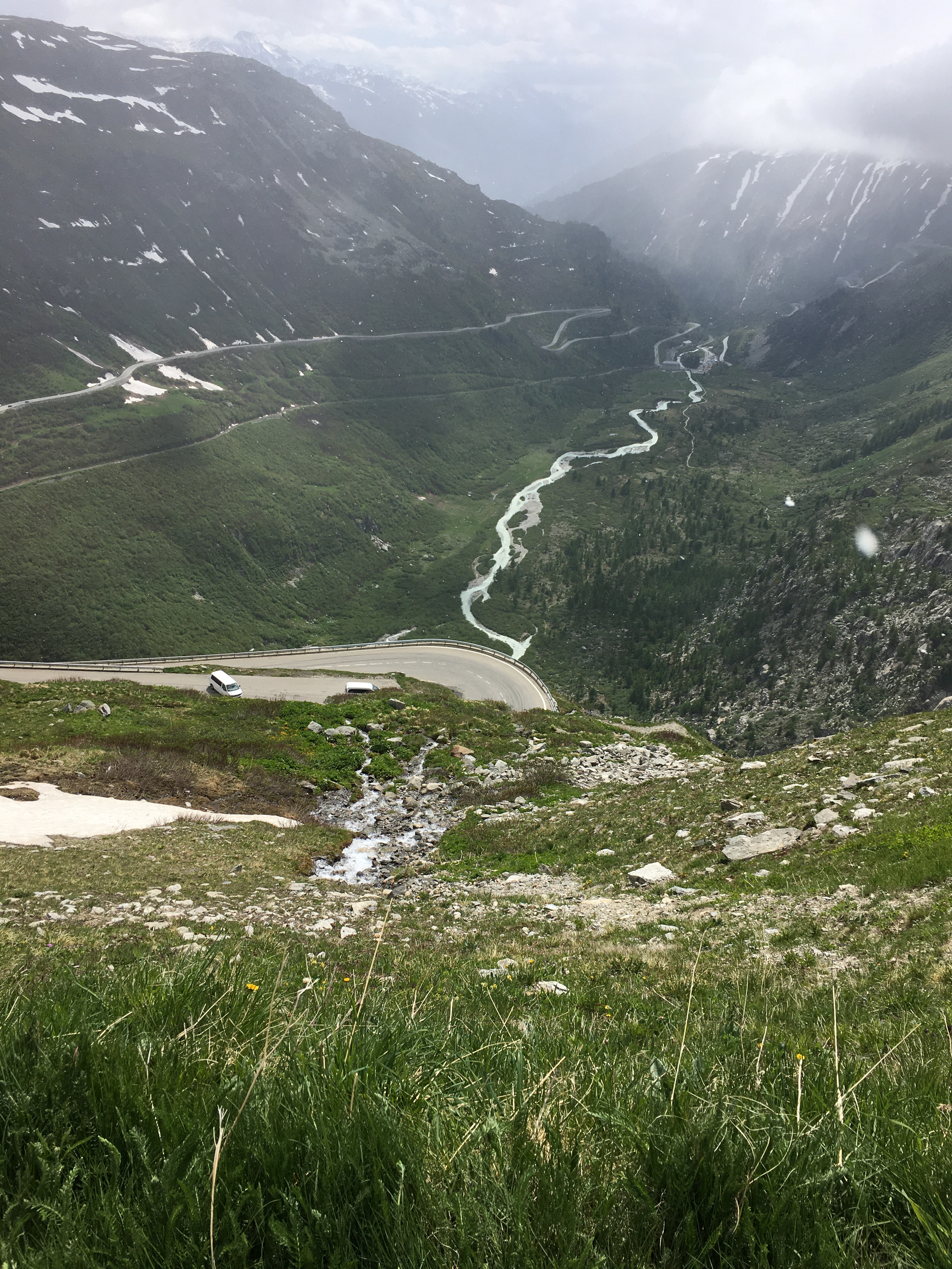 Sveitsin rajalla lakkasi kännykkä toimimasta. Mitenköhän tästäkin selvitään, mutta toisaalta onhan sitä reissattu ennenkin ilman kännykkää. Onneksi olin merkinnyt ylös hotellin osoitteen Bernissä, sillä muuten hotelli olisi jäänyt löytymättä. Tällä kertaa ystävälliset berniläiset auttoivat ja lopulta hotelli löytyi. Bern on jo kait sen verran kaukana Suomesta, että kaupungista lähtiessäni viereen pysähtyi henkilöauto, josta nainen huikkasi selvällä Suomen kielellä, että ”ei voi olla totta, olet sä ajanu tänne Suomesta asti”. Bernissä onnistuin kaatamaan pyöräni tehdessäni jyrkässä mäessä U-käännöstä, mutta ohikulkijoiden avustuksella pyörä saatiin aamuruuhkassa pystyyn. Matka jatkui kohti Geneve-järveä ’motaria’ pitkin. Tien varrella partioi yksittäiset haukat parin kilometrin välein omaa reviiriään, joko ilmasta käsin tai istuen aidan pylvään päässä. Geneve-järven rannalla oli sitten pysähdyttävä ottamaan valokuvia, sillä sen verran kauniit oli maisemat. Matka jatkui ja Alppien välinen laakso lähestyi. Laakson pohjalla virtasi Rhone-joen yläjuoksu, ennen sen virtaamista Geneve-järveen. Onneksi olin edellisiltana keksinyt keinon imuroida Sveitsin kartan kännykkään, sillä muuten olisi päivä ajoreitistä tullut todella tuskainen. Olin nimittäin ajatellut karttaa opiskellessani, että päivän reitti Wassenin kaupunkiin kulkisi mukavasti laakson pohjaan pitkin. Enempää en juuri olisi voinut erehtyä. Olisi pitänyt karttaa lukiessa tutkia myös korkeuseroja ja maanpinnan muotoja. Laakson puolivälissä tie alkoi nousta vuoren rinnettä ylöspäin. Sitten alkoi tihkusade, joka muuttui pian lumisateeksi, kunnes olin jo pilvien yläpuolella. Matkalla olin noussut laakson pohjan 500 metrin korkeudesta Belvedere-hotellin 2.500 metrin korkeuteen. Ja muita reittivaihtoehtoja ei ollut. Näissä maisemissa kuvattiin ’60-luvun Bond-elokuvan ”Gold finger” takaa-ajokohtaukset, mikä sekin tuli täytenä yllätyksenä.